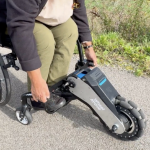 Riders simply attach WheelMove to the front of any standard wheelchair, and the device lifts the wheelchair’s smaller front wheels off the ground. Once attached, the rider controls the WheelMove through a basic remote control on their armrest, thigh, or wherever is most comfortable. The attachment weighs under 20 pounds, including its 10-inch wheel, 250W motor, and a battery that goes about 15 miles on a charge. Carrying an additional battery can double its range before needing to recharge, and it can navigate terrains including gravel, grass, and uneven surfaces like cobblestone.