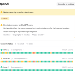OpenAI issued a status update noting that “elevated error rates” are occurring for ChatGPT and Platform users. All 13 components of ChatGPT are marked as having “degraded performance” on the OpenAI status page. “We are working on implementing a mitigation,” the company said, although it didn’t provide an anticipated timeline for when the issue might be resolved.
