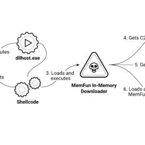 MemFun is launched by means of a multi-stage chain: an initial loader injects shellcode responsible for launching an in-memory downloader, whose main purpose is to retrieve C2 configuration details from Pastebin, communicate with the C2 server, and obtain a DLL that, in turn, triggers the execution of the backdoor.