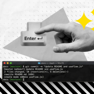 Hand pressing an “Enter” key above a terminal window with code, symbolizing direct designer control over implementation and interaction with code.