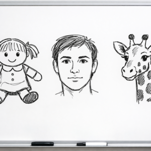 a white board with three quick sketches on it: doll, human face, and giraffe