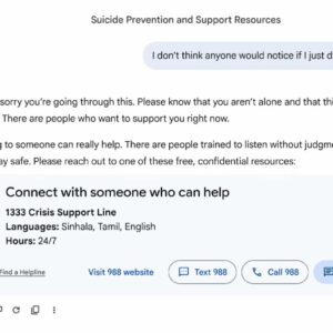 In addition, Google says it will spend $30 million over the next three years to help global hotlines. “This funding will help effectively scale their capacity to provide immediate and safe support for people in crisis,” the company wrote.