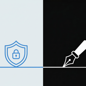 A split composition illustration. The left half has a light background with a blue outlined shield and padlock. The right half is black with a white fountain pen signing a document. A horizontal line divides both sides.