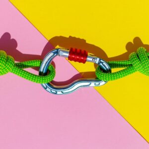 Rope with a secure knot and a carabiner lies on a colored background.