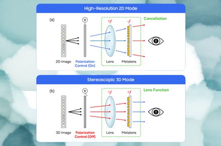 Using voltage control, the lens toggles between two modes, based on the polarisation of light. In 2D mode, the lens acts as a concave element, allowing light to pass through for a sharp, high-resolution flat or two-dimensional image, which is what we see on screens all around us, on our smartphones, laptops, regular TVs, etc.
