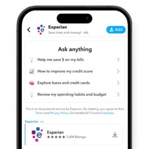 AI Sponsored Snaps will appear in the app’s Chat tab (with a light gray “Ad” notation next to the brand name). After opening the chat, you can ask the agent questions about the brand it represents. Snap showed an example from its first partner for the initiative, Experian. The bot offers to answer your questions on saving money, improving your credit score and — there it is — exploring loans and credit cards.