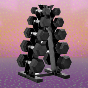 If you aren’t ready to give up the familiarity of traditional free weights, you could go for this CAP barbell rubber coated dumbbell weight set with a vertical rack (normally $189.99, currently on sale for $139.99).