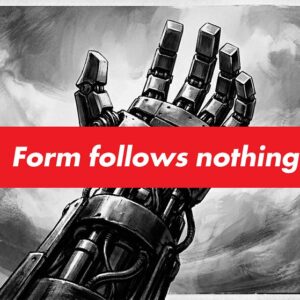 A robotic hand in Barbara Kruger’s graphic style overlaid with ‘Form follows nothing’ — inverting Sullivan’s ‘Form follows function’ to diagnose the structural absence in current AI systems. Generated by Google Gemini at the author’s direction. © 2026 Peter (Zak) Zakrzewski.